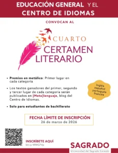 ¡Educación General y el Centro de Idiomas convocan al estudiantado para su cuarto Certamen Literario! Están aceptando todo tipo de textos y el primer lugar de cada categoría tiene premio en metálico. Aparte de esto, los textos ganadores del primer, segundo y tercer lugar serán publicados en el blog del Centro de Idiomas.
