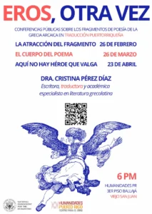 La segunda conferencia de la Dra. Cristina Pérez Díaz (escritora, traductora y académica especialista en literatura grecolatina), titulada “El cuerpo del poema”, será llevada a cabo este jueves, 26 de marzo en el 3er piso del Cuartel de Ballajá en San Juan a las 6:00 PM.