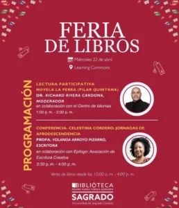 La Feria de Libros que estará realizando la biblioteca en colaboración con Epílogo, la asociación estudiantil de Escritura Creativa y Literatura, tiene como evento de cierre la conferencia «Celestina Cordero: Jornadas de Afrodescendencia» dictada por la autora Yolanda Arroyo Pizarro el próximo 22 de abril a las 2:30 p. M en el Learning Commons de la Biblioteca.